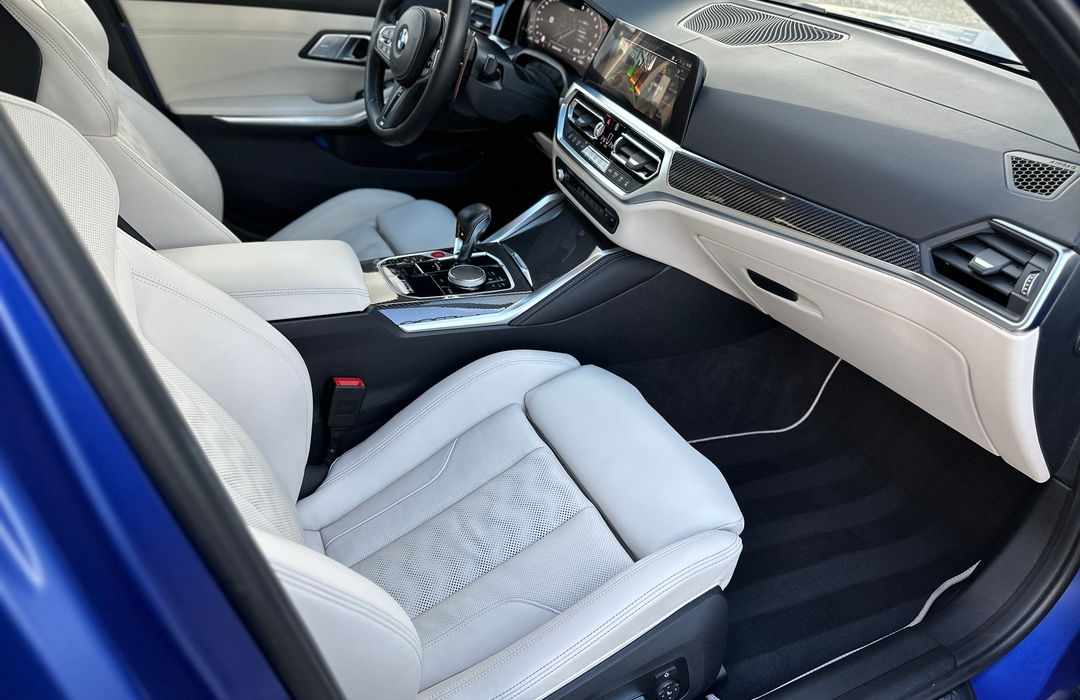 Fenomenální Individual BMW M3 xDrive v nádherné matné Frozen Portimao Blue Metallic barvě. Nehavarovaná, nelakovná, na všech panelech původní lak. Tovární záruka 7/2025! Z Hlavní výbavy: karbonový paket, laserová světla s vysvicováním protijedoucích aut, aktivní ventilovaná sedadla v bílé Individual Merino kůži, adaptivní ///M podvozek, Driving Assistant Professinal (držení v pruzích se samořízením + adaptivní tempomat + sledování slepého úhlu), Parking Assistant Professional (4 kamery a 360° ptačí pohled, samoparkování, varování před příčným provozem), Harman Kardon audio, M Drive Professional, M Sport diferenciál, karbon lišty v interiéru, Live Cocpit Professional s iDrive 7, head-up display, vyhřívané sedadla i vzadu, vyhřívaný volant, bezklíčkový přístup, elektrické zavírání kufru, Shadowline paket světel, galvanické ovládací prvky.